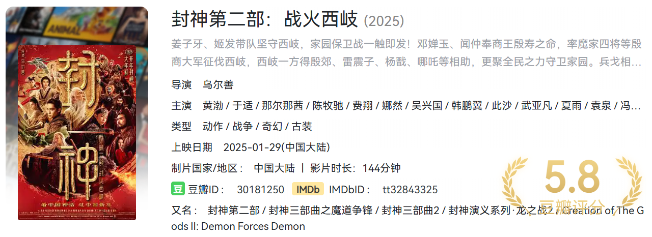 封神第二部:战火西岐 ( 2025年上映 )【2K超清画质 + 影院杜比音效】黄渤主演 栏目:电影区 作者:萝卜 时间:2025-12-19 23:35:36    **简介:** 这是2023年封神第一部的续作,非常好看,目前已出超清画质视频资源,纯2K,具有跟影院一样的杜比音效。 > [!success] **资源链接** > https://pan.quark.cn/s/c6ab545266de 版权声明:本站不存储任何实质资源,该帖为发布的网盘链接介绍帖。如您认为本站任何介绍帖侵犯了您的合法版权,请联系站长 ( 微信:huang_ssu ) 进行投诉,我们将在确认本文链接指向的资源存在侵权后,立即删除相关介绍帖子!